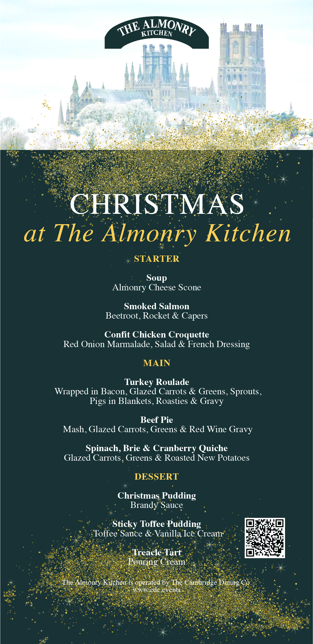 Celebrate the festive season in one of Ely’s most magical and historic settings. From the 1st November, we’re taking bookings for groups of four or more to enjoy a seasonal two course or three course Christmas lunch at The Almonry Kitchen. Tucked away from the hustle and bustle, our beautiful candlelit undercroft offers the perfect backdrop for a festive gathering with friends, family or colleagues. Enjoy a delicious, chef-prepared menu filled with classic Christmas flavours and warm hospitality. To book email almonry@cdc.events